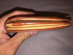 そんな感じでフリーポケットをすべて使っているのですが、それでも財布自体は十分な薄さを保ってくれているので、ズボンの後ろポケットにもストレスなく収まります。