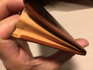 そこで店員さんと相談して、外側は色味の変化したヌメ革に近い色のブランデーカラーの「イタリアンレザー」、内側が私が散々口走ってた「ヌメ革」からできている、「マットーネ マルチウォレット」に決めてくれました。