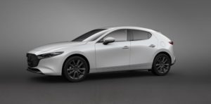 マツダ3はグリル、シグネチャーウィング、リヤバンパー下部などの面積の広い部分がブラックアウトされてあるので、ボディカラーがホワイトだとメリハリが生まれるので相性がよいのです。
