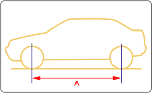 フロントオーバーハングは、フロントタイヤの中心からフロントの最先端部分までの距離を指します。(画像のAの部分です)