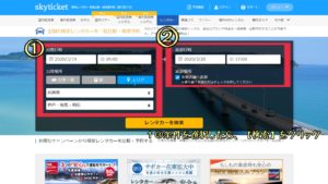 • トップ画面で①出発日時と場所②返却日時を選択後に、③検索ボタンをクリック