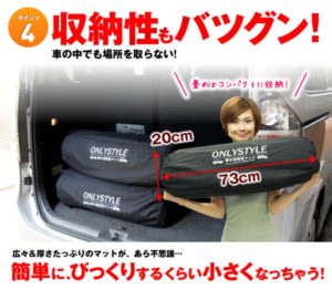 これだけの厚みのあるマットなのに、収納時のサイズは【Φ20×73cm】というコンパクトさを実現しており、ラゲッジルームを占拠してほかの荷物が積めなくなるという心配もいりません。
