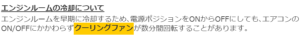 アフタークーリングとは、熱くなったエンジン及びエンジン冷却水を冷却するために、エンジンを切った後もラジエターに取り付けられているクーリングファンを一定時間、作動させるというものです。